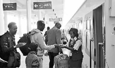 由中國(guó)企業(yè)采用全套中國(guó)標(biāo)準(zhǔn)和中國(guó)裝備建造的非洲第一條跨國(guó)現(xiàn)代電氣化鐵路——亞吉鐵路于2018年1月正式投入商業(yè)運(yùn)營(yíng)。圖為3月25日,在埃塞俄比亞首都亞的斯亞貝巴,列車員在亞吉鐵路拉布車站檢票。新華社發(fā)