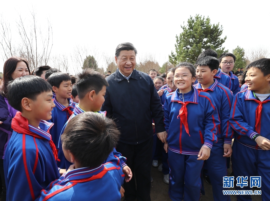 4月8日,黨和國家領(lǐng)導(dǎo)人習(xí)近平、栗戰(zhàn)書、汪洋、王滬寧、趙樂際、韓正、王岐山等來到北京市通州區(qū)永順鎮(zhèn)參加首都義務(wù)植樹活動(dòng)。這是習(xí)近平同少先隊(duì)員在一起。新華社記者鞠鵬 攝
