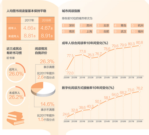 第十六次全國(guó)國(guó)民閱讀調(diào)查16日在京發(fā)布調(diào)查結(jié)果。數(shù)據(jù)顯示,2018年我國(guó)成年人人均紙質(zhì)圖書(shū)閱讀量為4.67本,成年人人均電子書(shū)閱讀量為3.32本。