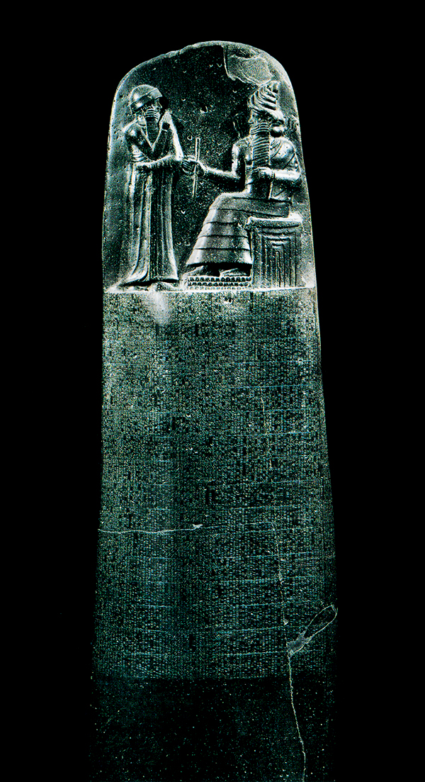 《漢穆拉比法典》是古代兩河流域文明的象征。這座在公元前18世紀(jì)建造的玄武巖石碑,上端有漢穆拉比從太陽神沙馬什手中接受權(quán)杖的浮雕像,下面用楔形文字銘刻法典全文。法典除序言和結(jié)語外,計(jì)有3500行、282條,包括訴訟手續(xù),財(cái)產(chǎn)權(quán),損害賠償,租佃關(guān)系,債權(quán)債務(wù),婚姻家庭,繼承以及買賣奴隸等內(nèi)容,是迄今世界上完整保存下來的最早的一部法典。圖為現(xiàn)藏于法國巴黎盧浮宮的《漢穆拉比法典》。