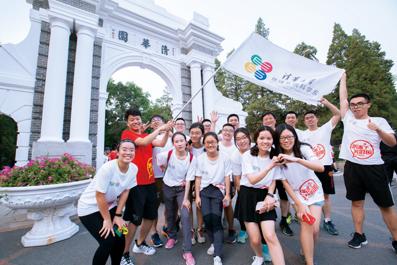 每年的畢業(yè)季,清華大學(xué)都會(huì)舉行畢業(yè)長跑,即將離開母校的學(xué)子們沿著精心設(shè)計(jì)的路線,依次跑過那些承載著清華記憶的場(chǎng)所,重溫“自強(qiáng)不息 厚德載物”的校訓(xùn),上好離校前的“最后一課”。圖為2018年7月4日,畢業(yè)生們?cè)谥黝}為“擁抱新時(shí)代 青春正起航”的長跑活動(dòng)中在二校門前合影。 清華大學(xué) 李浩然/攝