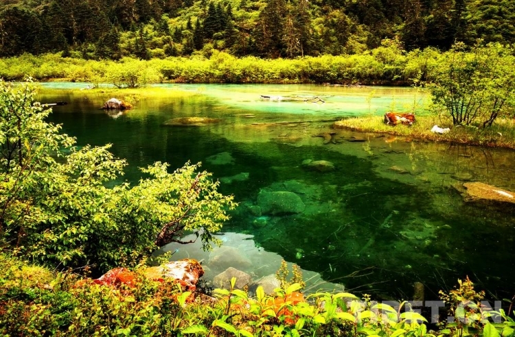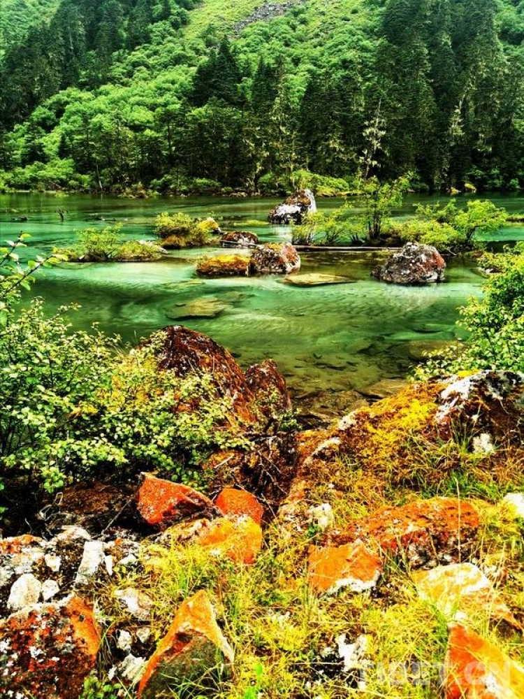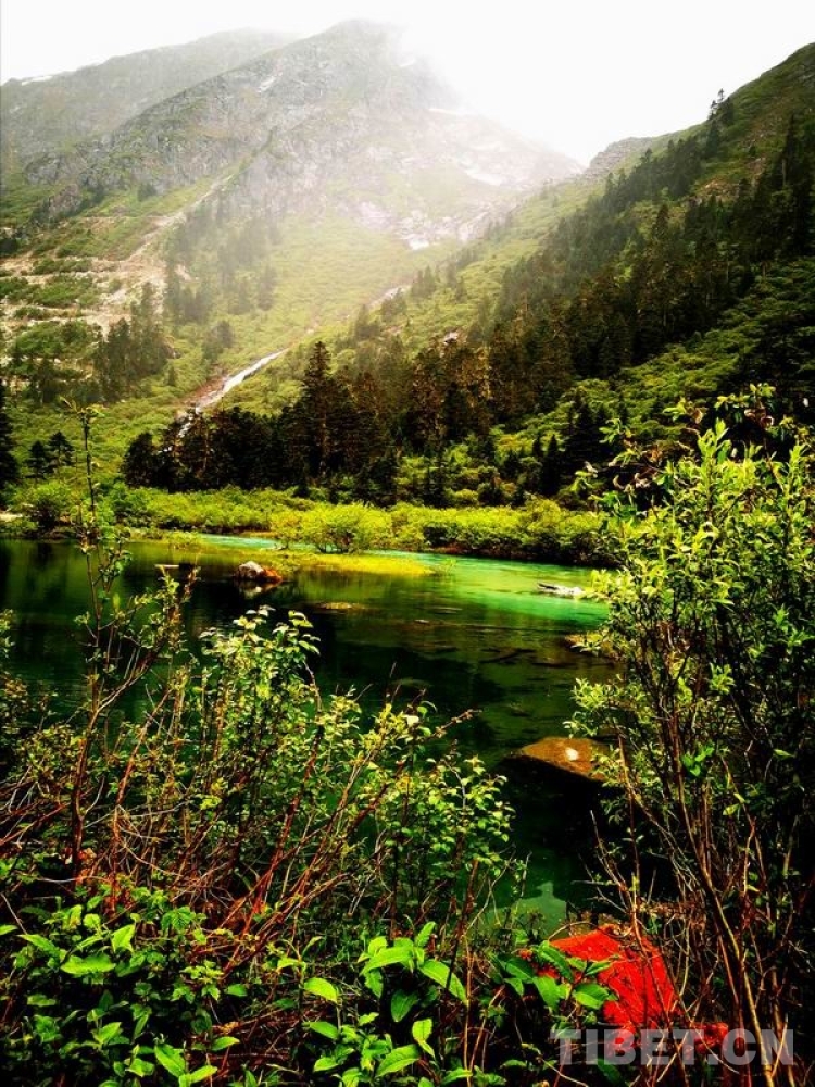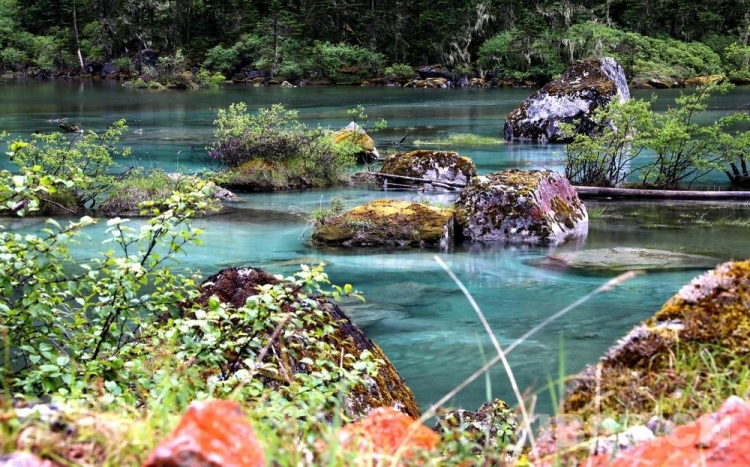 少女般的冰湖,藏于青山綠樹(shù)中,伏于深林密草內(nèi),異常迷人。站在不同的視角看冰湖,同一水域,卻有不同的顏色,綠中透著藍(lán),藍(lán)中泛著橙、橙中映著赤、赤中蘊(yùn)著黃,斑斕奪目,攝人心魄。湖水周?chē)幕ú輼?shù)木長(zhǎng)得異常茂盛,五光十色的倒影使湖水更加瑰麗。
