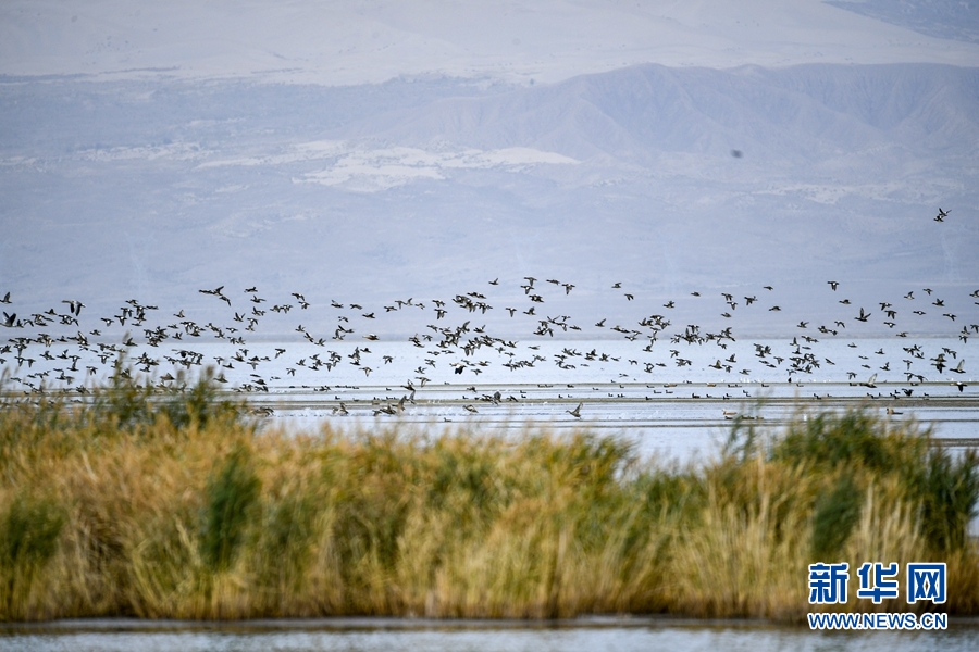 成群的赤麻鴨在海西州烏蘭縣都蘭湖國(guó)家濕地公園飛翔盤旋。