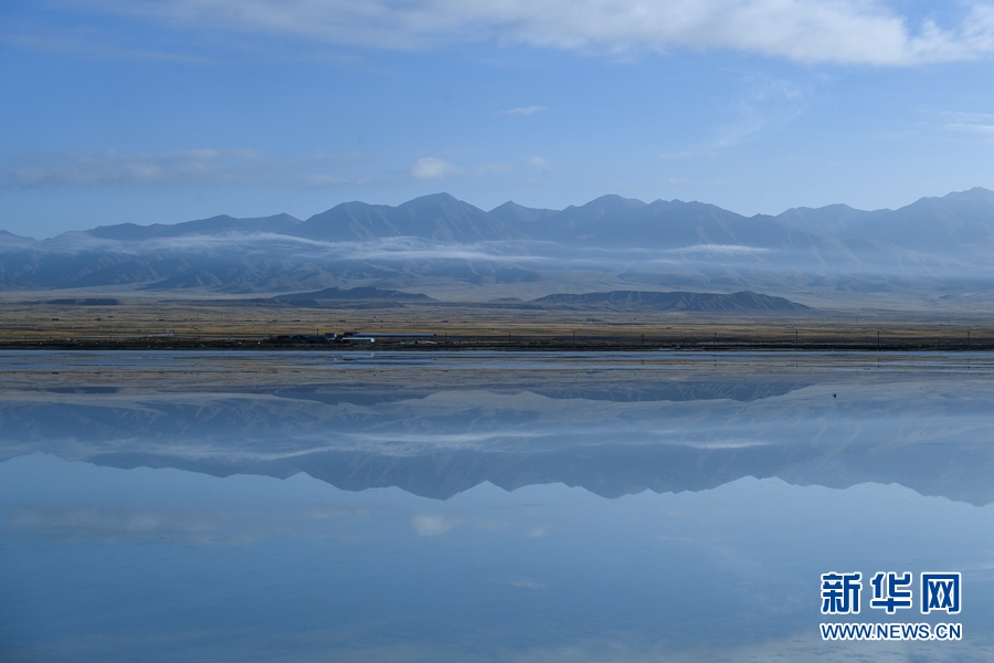 茶卡鹽湖的清晨,平波微漾,山水共長(zhǎng)天一色,神秘清幽,令人陶醉。新華網(wǎng) 潘彬彬攝