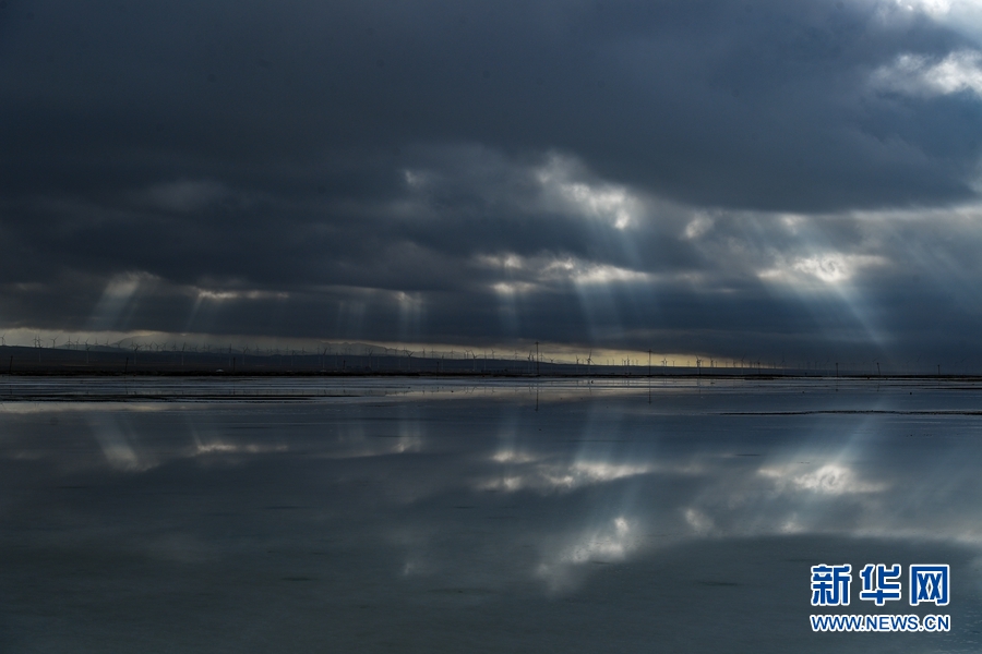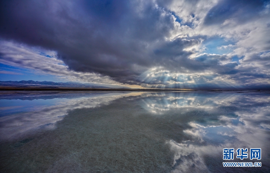 一縷縷金色的陽(yáng)光透過(guò)云層的間隙,照射在干凈的湖泊上,形成茶卡鹽湖獨(dú)特的美。新華網(wǎng)發(fā)(宋忠勇攝)