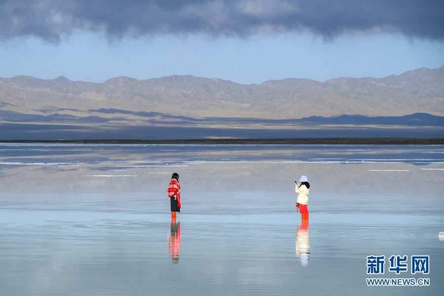 兩位游客在茶卡鹽湖內(nèi)拍照。新華網(wǎng) 潘彬彬攝