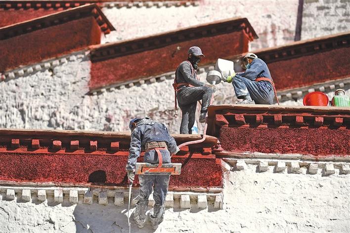 世界文化遺產(chǎn)布達(dá)拉宮10月26日起迎來(lái)了一年一度的粉刷季,工作人員將用10余天的時(shí)間對(duì)宮墻、白塔、窗框進(jìn)行整體粉刷,為布達(dá)拉宮美顏。圖為10月28日,施工人員給布達(dá)拉宮墻體噴灑涂料。記者 李洲 洛桑 攝