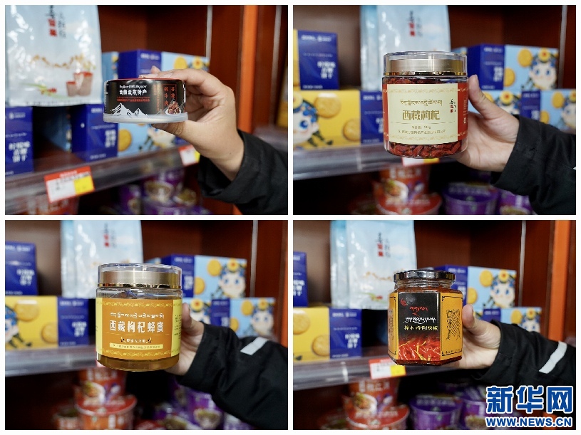 拼版照片:扶貧專(zhuān)柜內(nèi)擺放的日喀則特色產(chǎn)品(10月24日攝)。新華網(wǎng) 達(dá)珍 攝