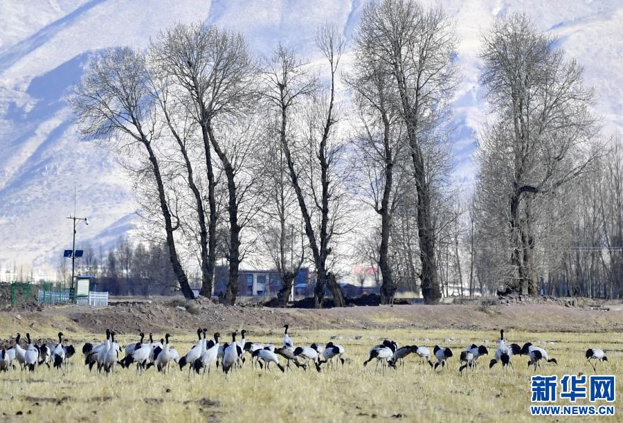 林周縣黑頸鶴自然保護(hù)區(qū)里的黑頸鶴(12月12日攝)。新華社記者 張汝鋒 攝