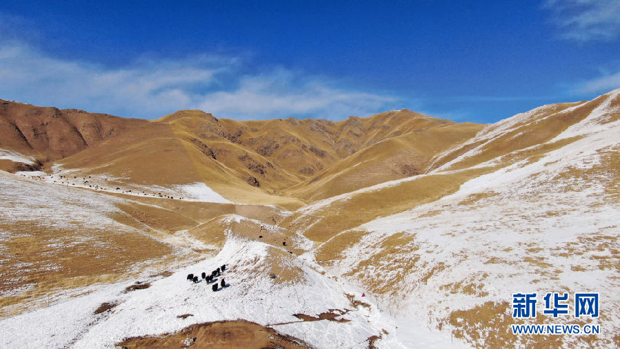 在青海省祁連縣,一群牦牛在雪后活動(dòng)(12月7日攝,無人機(jī)照片)。新華社記者 張宏祥 攝