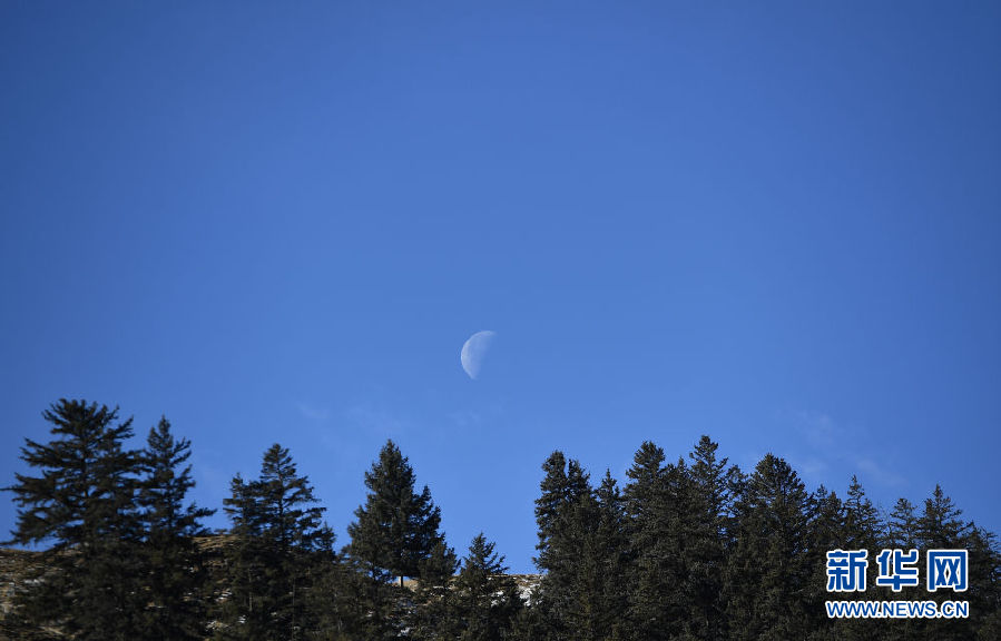 在青海省祁連縣,森林與月亮相映成畫(12月8日攝)。新華社記者 張宏祥 攝
