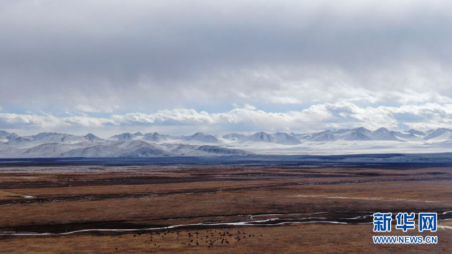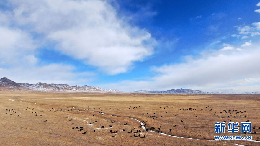 在青海省祁連縣,一群牦牛在草原上活動(dòng)(12月10日攝,無人機(jī)照片)。新華社記者 張宏祥 攝