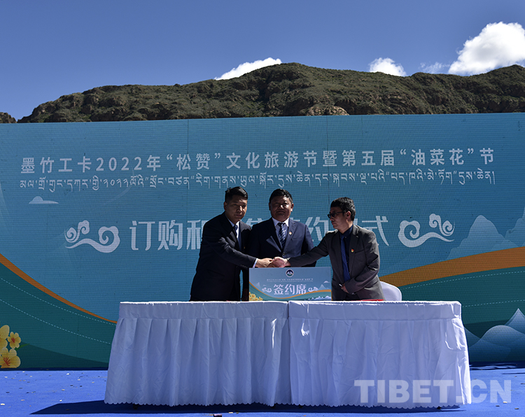 圖為墨竹工卡縣松贊文化旅游節(jié)暨第五屆油菜花節(jié)開幕式上,墨竹工卡縣農(nóng)牧業(yè)凈土產(chǎn)業(yè)發(fā)展有限公司代表與唐加鄉(xiāng)、扎西崗鄉(xiāng)分別簽訂認購、預售合同 攝影:王媛媛