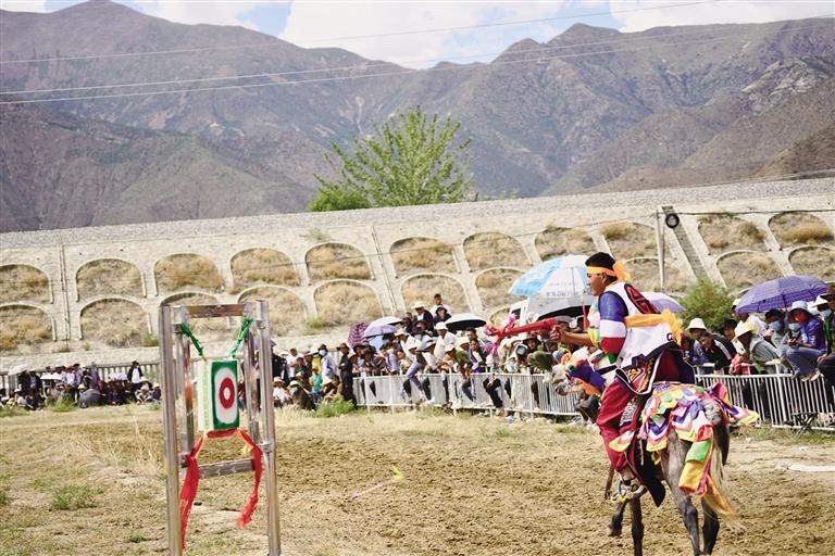 當(dāng)日上午11時(shí),茶巴朗村望果節(jié)賽馬正式開始,騎手們身著傳統(tǒng)服飾,戴著紅纓帽,身背彎弓,騎著打扮華麗的駿馬,進(jìn)行了4000米速度賽馬、拾哈達(dá)、射箭、馬術(shù)等精彩比賽。現(xiàn)場,觀眾揮舞手臂為選手們鼓勁吶喊。馳騁在賽場上,選手的吆喝聲伴著觀眾的吶喊聲在賽場上空匯聚。