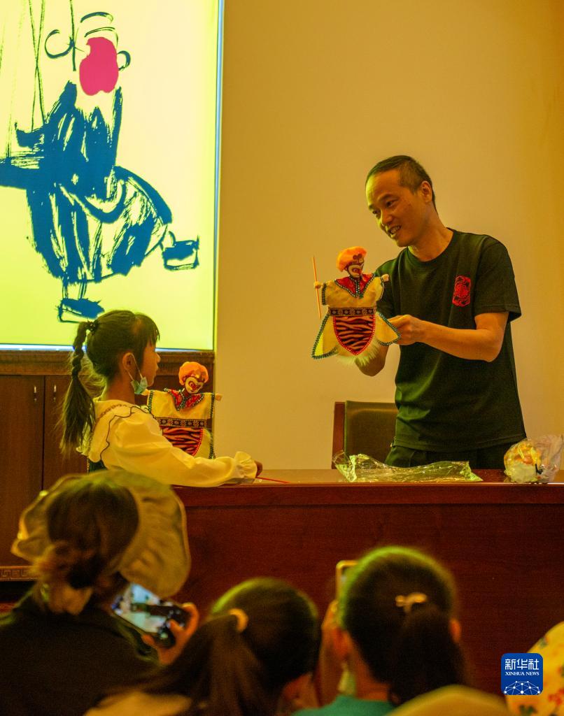 7月29日,泉州市提線木偶戲傳承保護中心國家一級演員沈蘇革(右)在展覽上為拉薩小學生講解木偶戲。新華社記者 劉洲鵬 攝