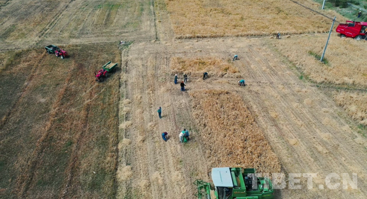 在達(dá)孜區(qū)雪鄉(xiāng)扎西崗村,隨著機(jī)器轟鳴,一顆顆金色飽滿的青稞粒構(gòu)成一扇彩虹門,有人在曬青稞、有人在裝袋、有人在搬運(yùn),一幅和諧的秋收?qǐng)D展現(xiàn)在眼前?! ?/p>
