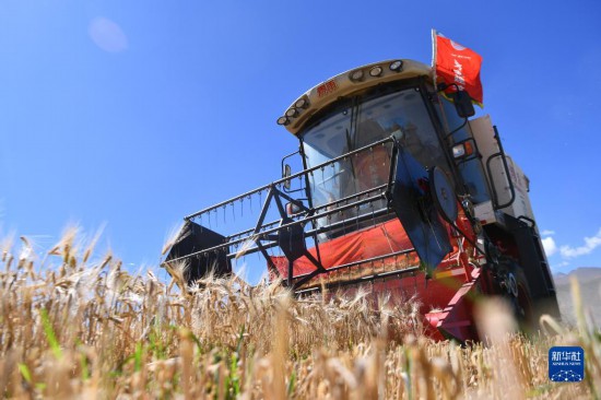 西藏日喀則市江孜縣熱索鄉(xiāng)努康村農(nóng)機(jī)合作社的村民集中對(duì)村里三千多畝耕地進(jìn)行機(jī)械化收割(9月19日攝)。記者 晉美多吉 攝