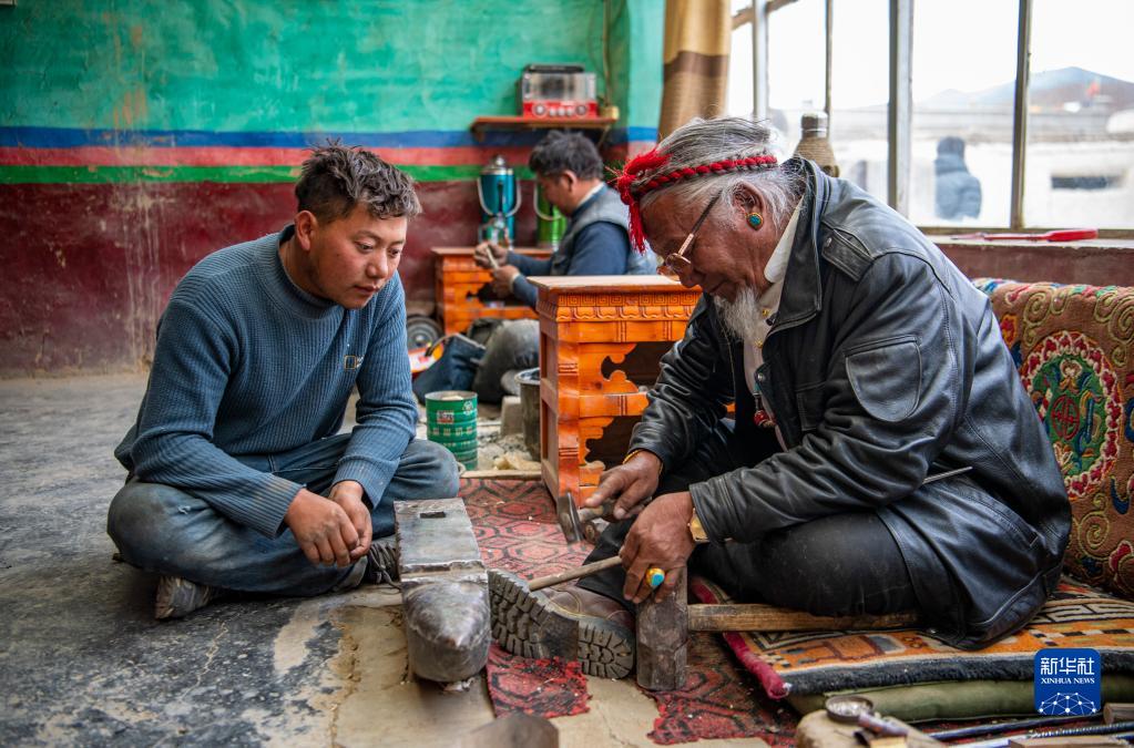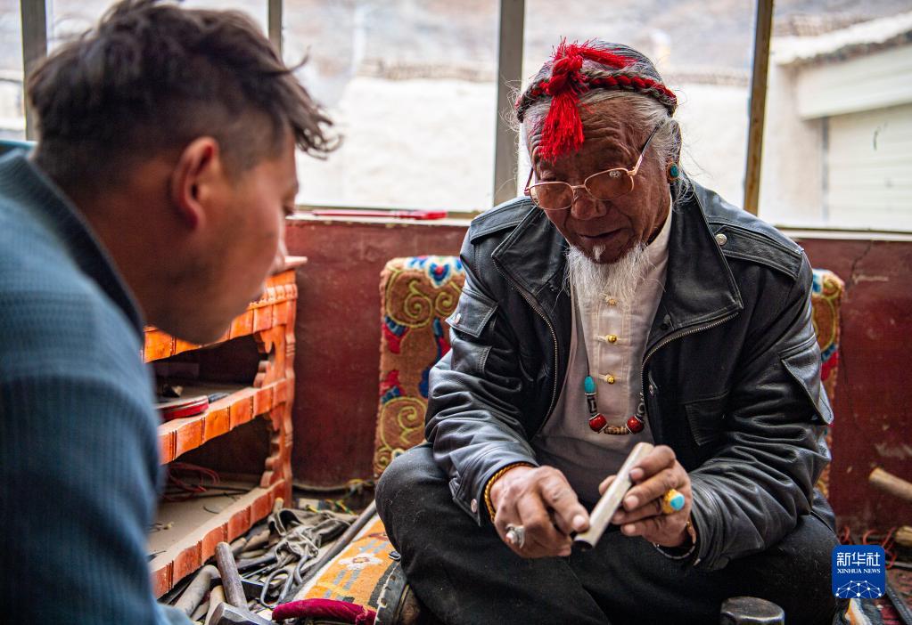 在拉孜縣柳鄉(xiāng)孜龍村,次旦旺加(右)在指導(dǎo)孫子制作藏刀(3月17日攝)。新華社記者 孫非 攝