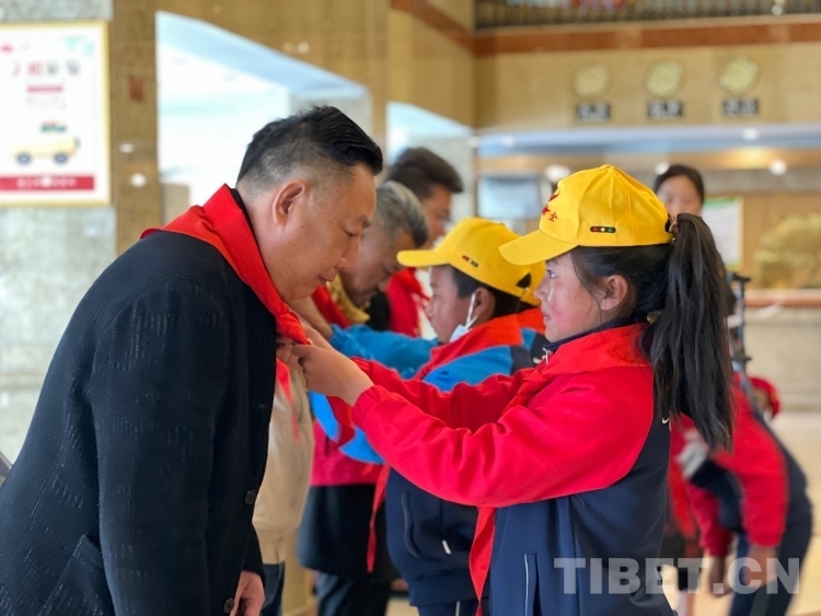 圖為學生代表向相關(guān)領(lǐng)導佩戴紅領(lǐng)巾 攝影:德吉卓瑪