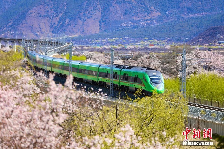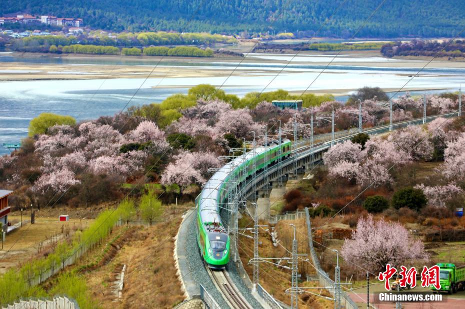 近日,中國鐵路青藏集團(tuán)有限公司介紹,3月下旬至4月,拉林鐵路沿線綿延的野生桃花林盛開,藍(lán)天、白云、桃花、雪山、高原復(fù)興號(hào)動(dòng)車等相互交織,形成了一幅幅美不勝收的畫面。圖為穿梭在桃花林中的拉林鐵路高原復(fù)興號(hào)。