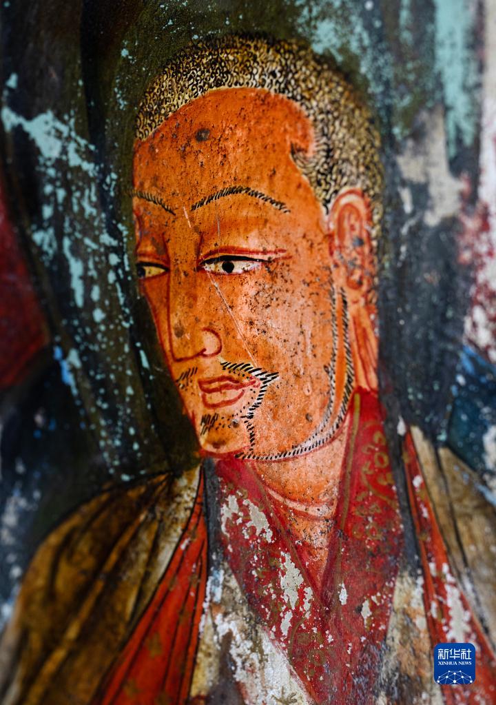 這是5月26日拍攝的皮央石窟壁畫(huà)中的長(zhǎng)胡子的人物造型。新華社記者 費(fèi)茂華 攝