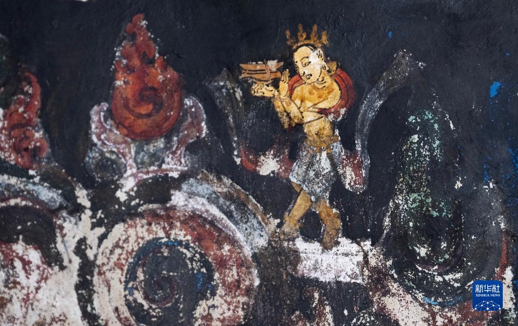 這是5月26日拍攝的皮央石窟壁畫(huà)中的長(zhǎng)翅膀的人物造型。新華社記者 費(fèi)茂華 攝