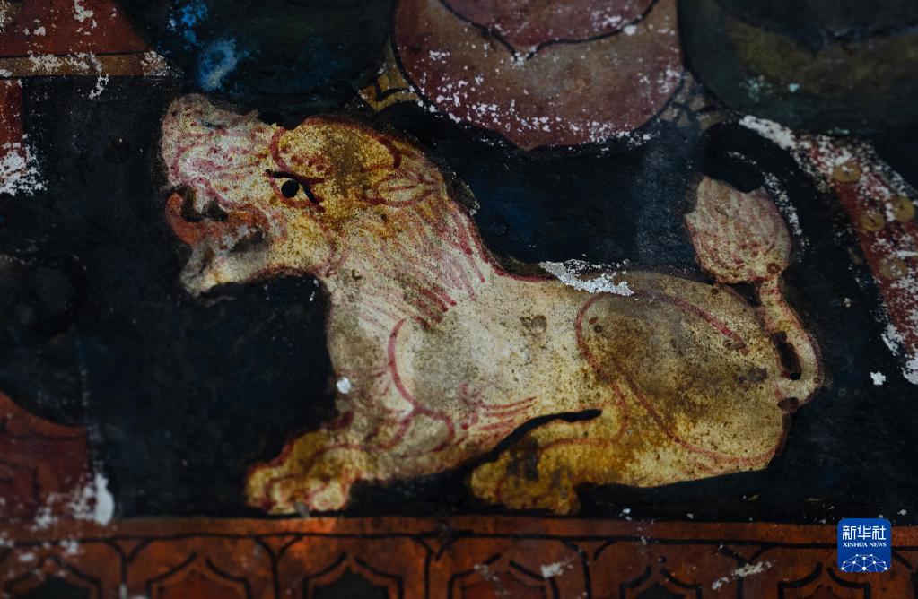 這是5月26日拍攝的皮央石窟壁畫(huà)中的獅子像。新華社記者 費(fèi)茂華 攝