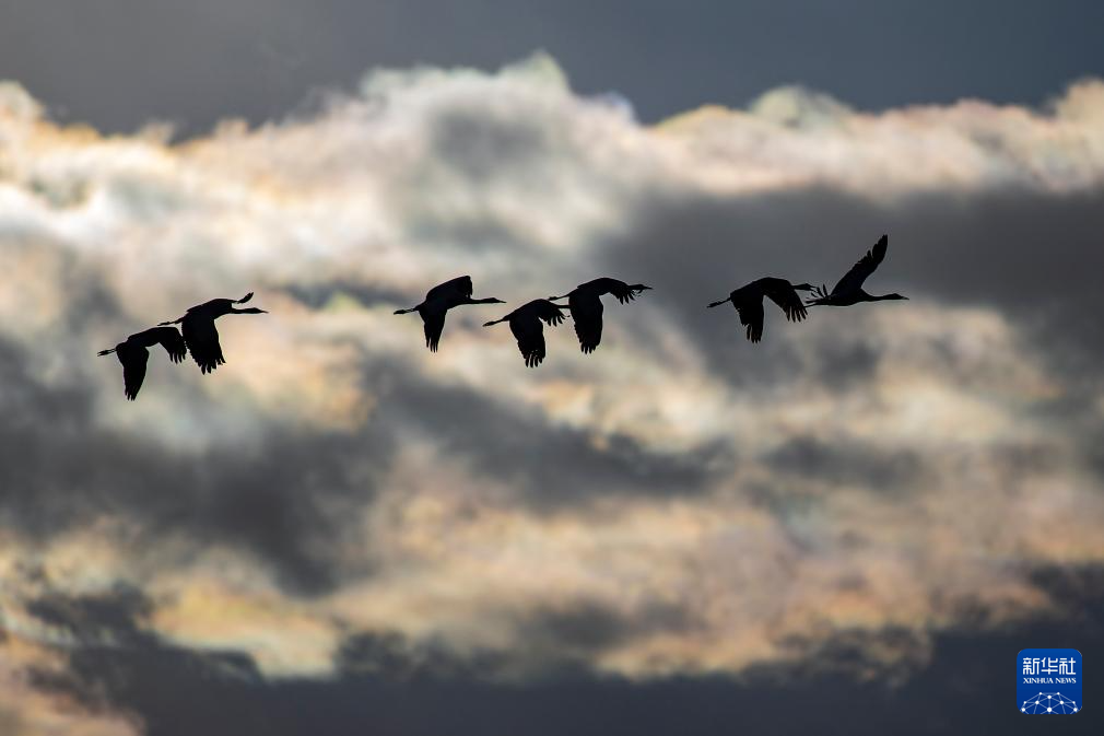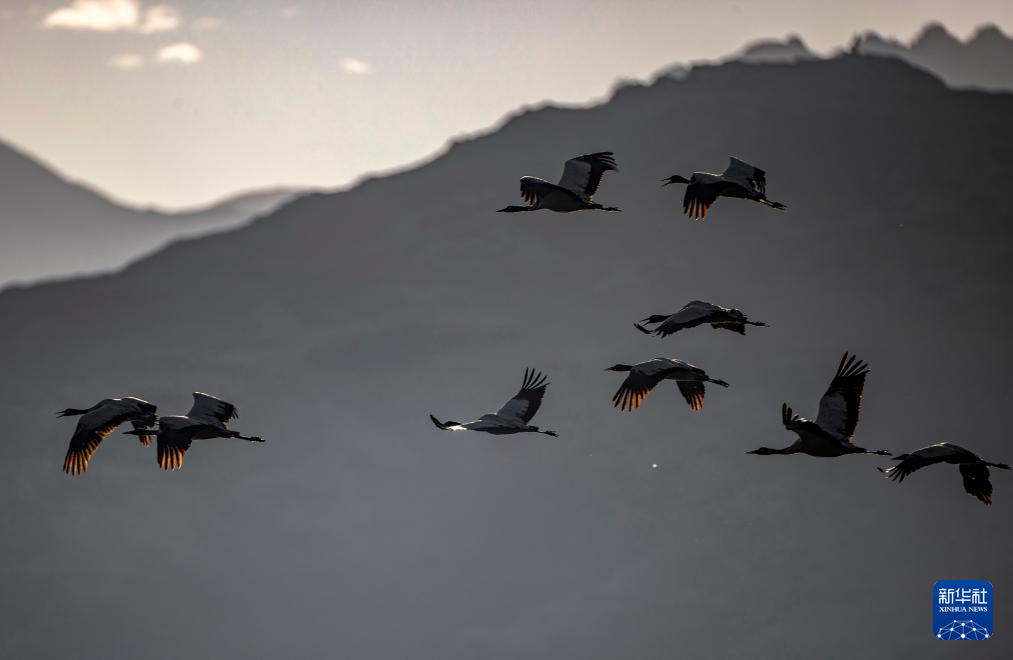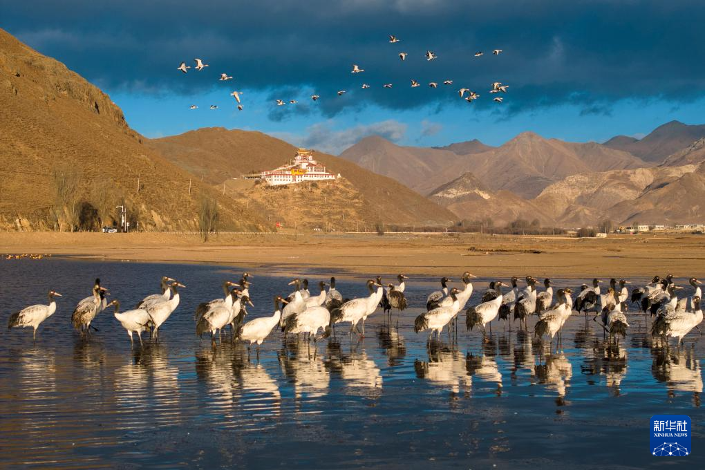 這是12月5日清晨在拉薩市林周縣虎頭山水庫(kù)拍攝的越冬黑頸鶴。新華社記者 曹檳 攝