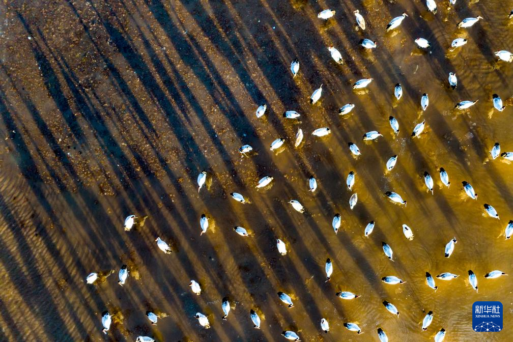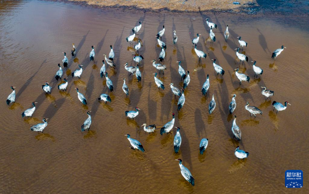 這是12月5日清晨在拉薩市林周縣虎頭山水庫(kù)拍攝的越冬黑頸鶴(無人機(jī)照片)。新華社記者 姜帆 攝