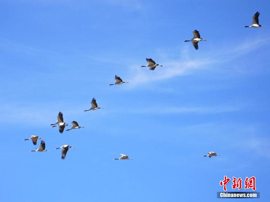 圖為黑頸鶴在雅魯藏布江上空飛舞。袁相普 攝