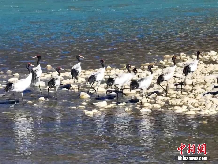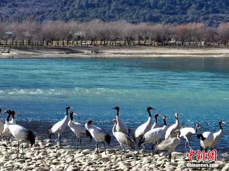 圖為黑頸鶴在雅魯藏布江畔覓食、嬉戲。德吉 攝
