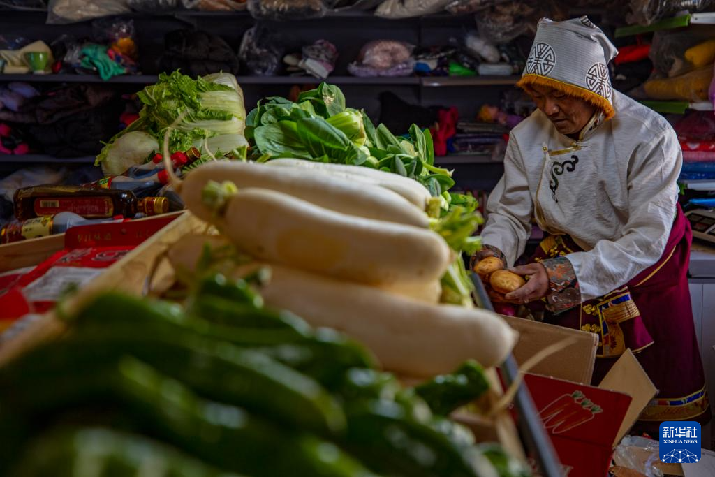 申扎縣馬躍鄉(xiāng)貝嘎四村“偏遠(yuǎn)鄉(xiāng)鎮(zhèn)果蔬配送試點(diǎn)項(xiàng)目”直銷點(diǎn),店主西熱加措在整理供銷社配送來(lái)的新鮮蔬菜(1月5日攝)。新華社記者姜帆 攝