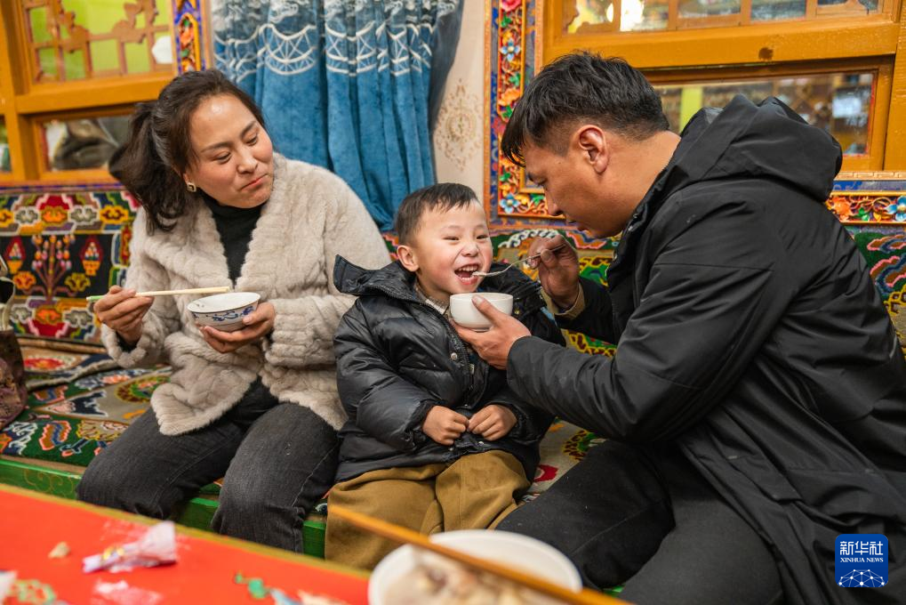 巴桑普尺一家人在吃“古突”(1月10日攝)。新華社發(fā)(丁增尼達(dá) 攝)