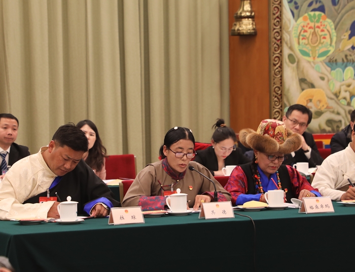 圖為其德在十四屆全國(guó)人大二次會(huì)議西藏代表團(tuán)開放團(tuán)組會(huì)議上發(fā)言攝影:桑吉