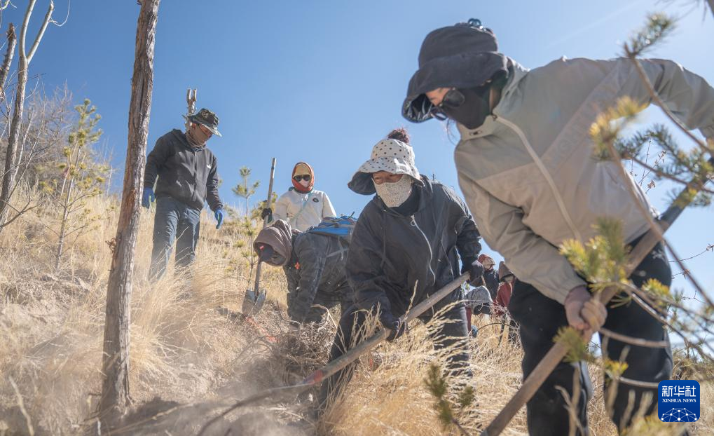 3月12日,仁增(中)和東嘎社區(qū)二組村民在植樹。新華社記者 丁增尼達(dá) 攝 ??