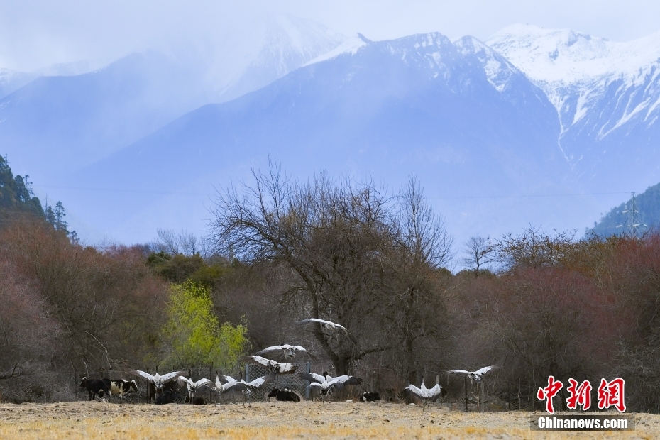 3月30日,在西藏林芝市巴宜區(qū)更章門巴民族鄉(xiāng),黑頸鶴與周邊的村莊、桃花、雪山融為一體,成為春日里的一道靚麗的風景線。圖為黑頸鶴在田間覓食嬉戲。中新社記者 貢嘎來松 攝