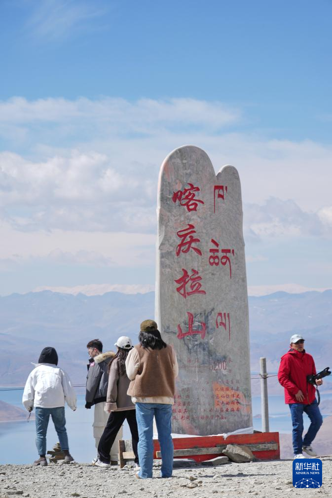 游客在喀慶拉山上俯瞰羊卓雍錯(cuò)(4月5日攝)。新華社記者 張汝鋒 攝