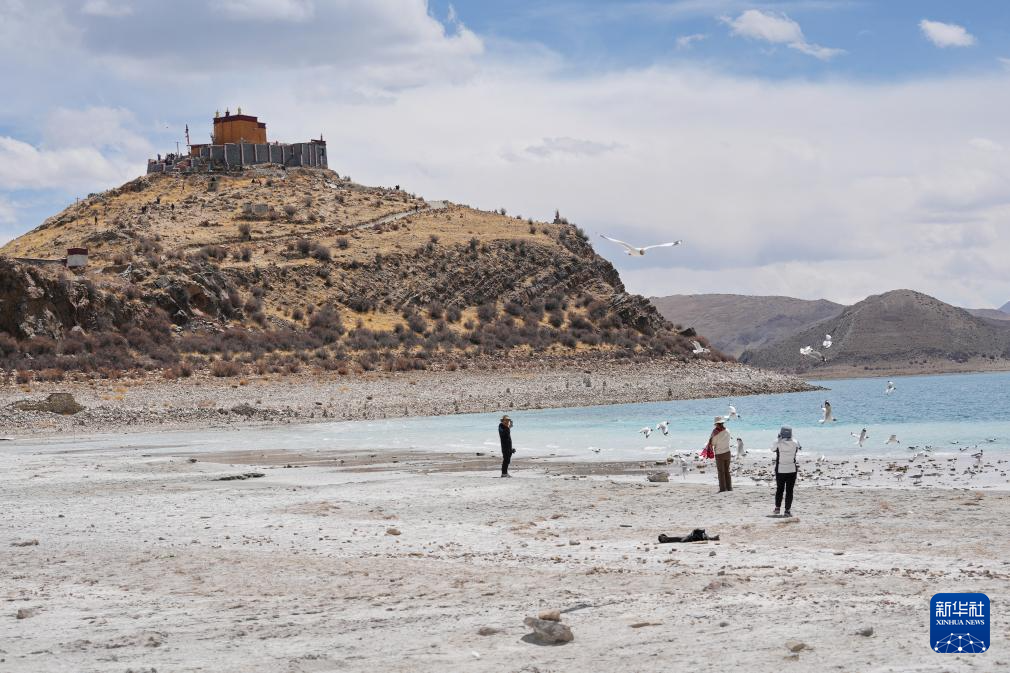 游客在羊卓雍錯(cuò)岸邊投喂棕頭鷗(4月5日攝)。新華社記者 姜帆 攝