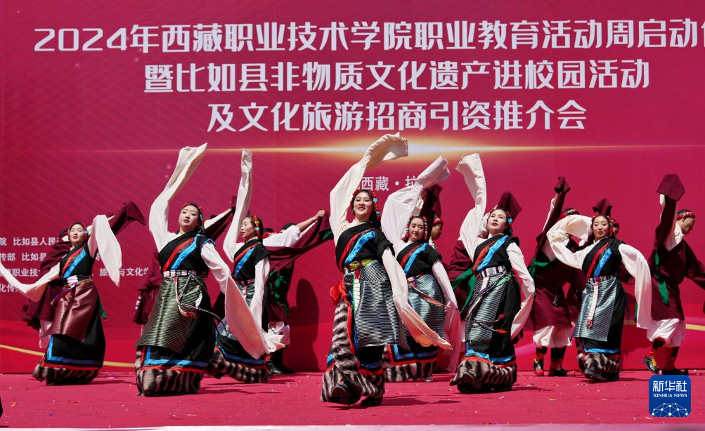 當日,西藏職業(yè)技術學院職業(yè)教育活動周在拉薩啟動,那曲市比如縣民族藝術團非物質文化遺產(chǎn)表演暨“鄉(xiāng)村振興 那曲奮進”旅游推介走進校園,激發(fā)人們對傳統(tǒng)文化和特色旅游的興趣?! ??