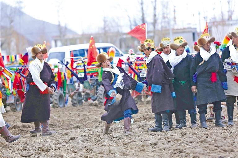 墨竹工卡縣甲瑪鄉(xiāng)龍達(dá)村村民在春耕儀式上開(kāi)展打牛角活動(dòng)。