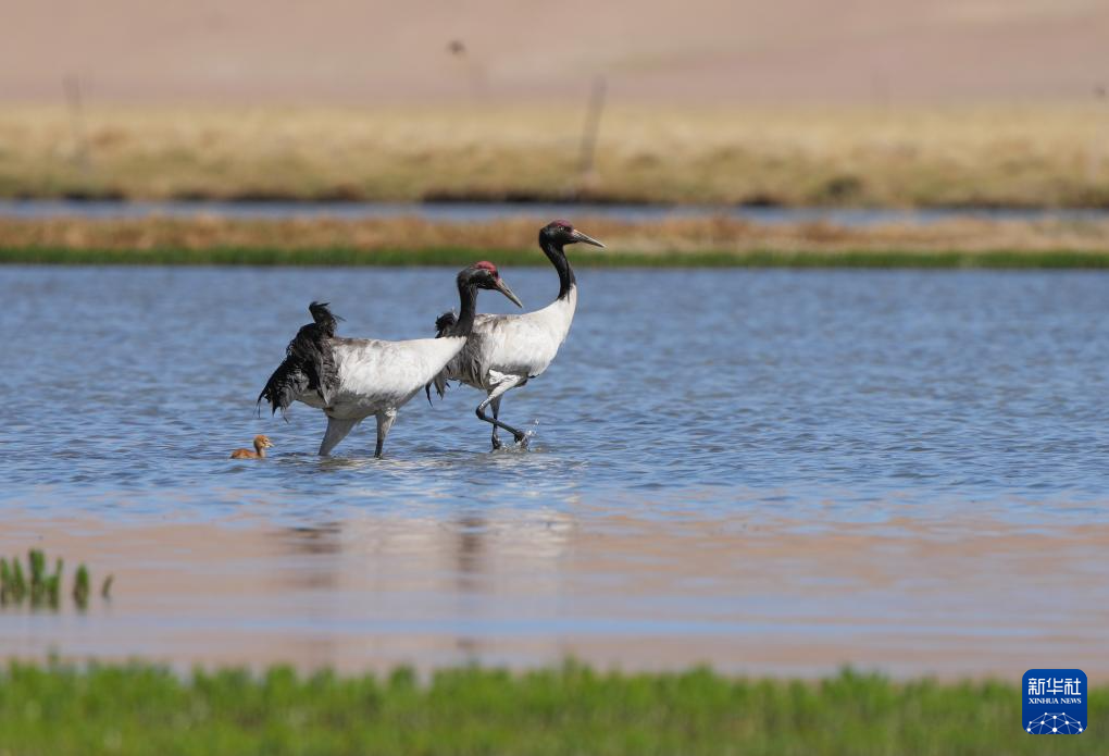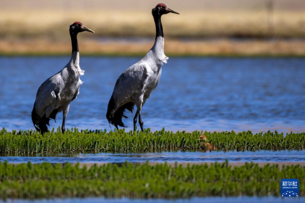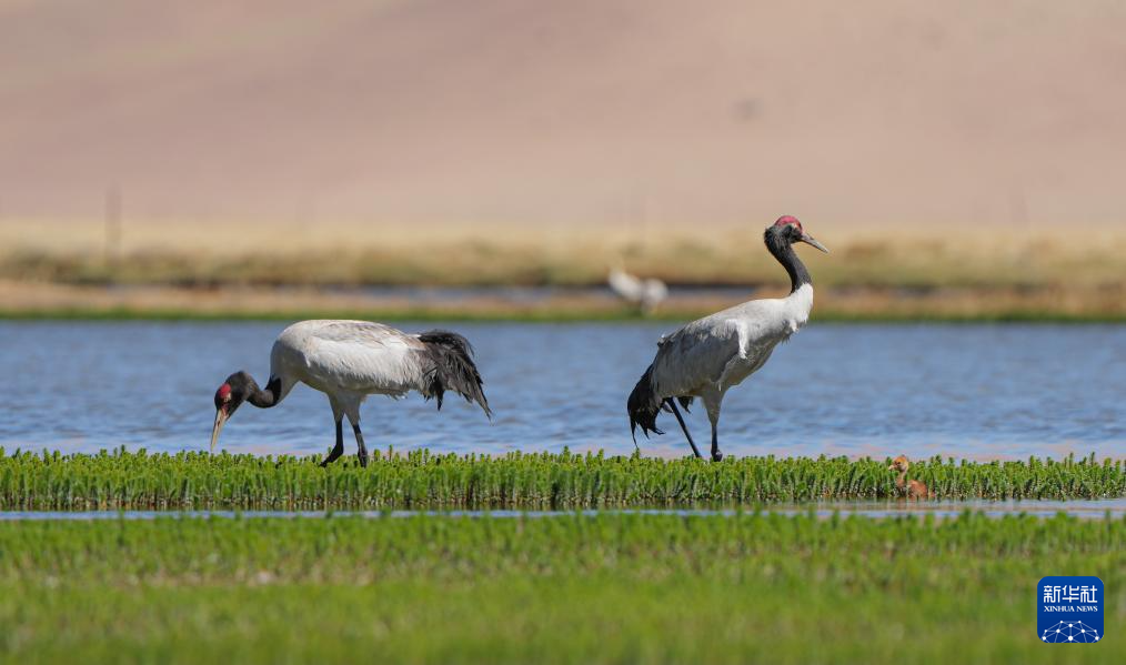 6月9日,一對黑頸鶴夫婦帶著雛鳥在西藏那曲市申扎縣一處濕地棲息、覓食。新華社記者 晉美多吉 攝