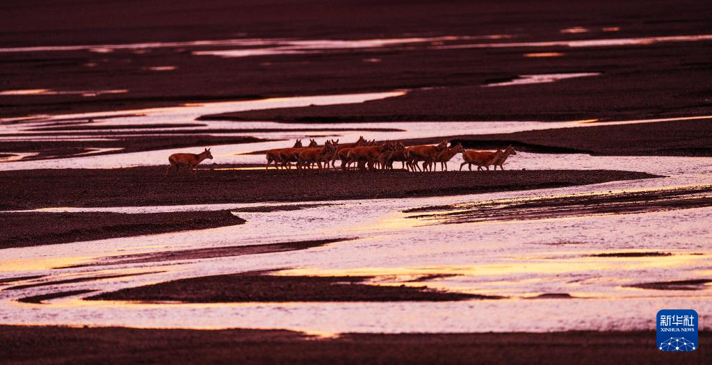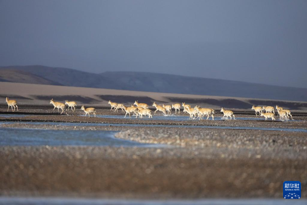 6月13日傍晚,在羌塘國家級自然保護(hù)區(qū),遷徙中的母藏羚羊越過甜水河。新華社記者 費茂華 攝