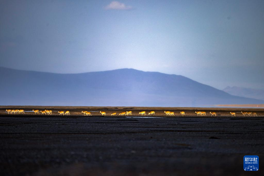 6月13日傍晚,在羌塘國家級自然保護(hù)區(qū),一群藏羚羊在遷徙。新華社記者 費茂華 攝