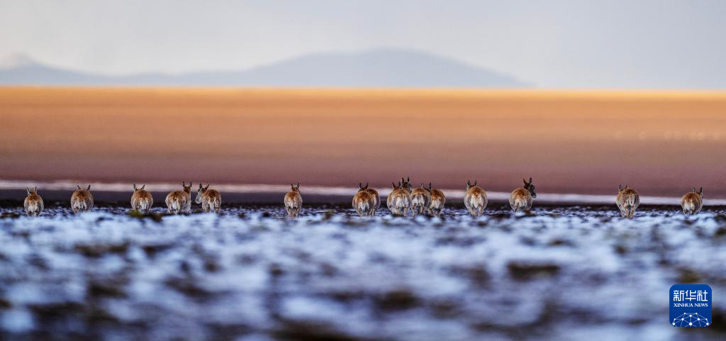 6月15日清晨雪后,在羌塘國家級自然保護(hù)區(qū),迎著朝霞前行在遷徙路上的一群藏羚羊。新華社記者 費茂華 攝