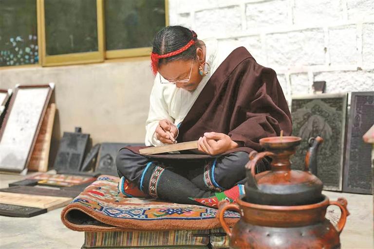 在傳承技藝的過程中,斯曲也面臨著不少挑戰(zhàn)。教徒弟時最大的困難就是讓他們靜下心來,因為這門手藝需要從小學(xué)起,不僅要學(xué)習(xí)拿工具,還要學(xué)習(xí)認(rèn)字和雕刻?!耙郧肮馐菍W(xué)習(xí)雕刻文字,起碼要9個月時間,現(xiàn)在的孩子都很聰明,兩年基本就能掌握雕刻技藝。”斯曲欣慰地說。