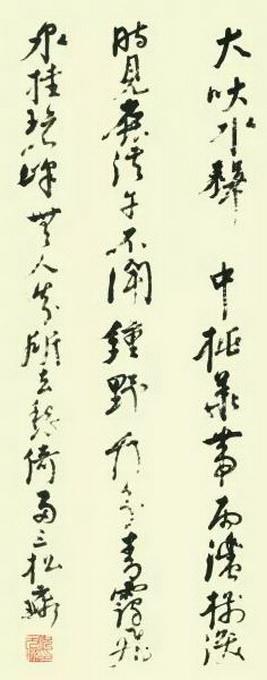 倪元璐書法流利秀雅,兼有澀勁樸茂的風(fēng)貌,風(fēng)骨凌厲,異態(tài)高古,格調(diào)曠達(dá)。用筆深得顏魯公厚實(shí)勁健之筆意,更為勁峭,結(jié)體趨于扁方,呈欹側(cè)之勢(shì),以險(xiǎn)寓正,風(fēng)格奇倔剛毅,自成一格。此行書豎幅《李白< ="" ="" ="" ="">》,絹本,縱103.7cm,橫60.3cm,現(xiàn)藏上海博物館。