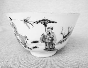 在茶盅底部,有大清光緒年制的底款,看來(lái)正制作于該時(shí)期。光緒年間,正是我國(guó)最后一個(gè)封建王朝清朝的黃昏之旅,國(guó)家內(nèi)憂外患,官員自保不暇,百姓人人自危,似在走向窮途末路。制作茶盅的匠人,大概也希望能像畫面中的老者一樣,回鄉(xiāng)隱居,在山間林舍終老一生。但對(duì)于受官府管控的皇家官窯工匠來(lái)說(shuō),這樣的愿望,無(wú)異是一種可望而不即的奢望。
