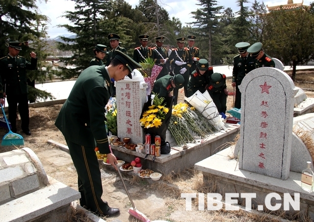 圖為西藏公安邊防總隊官兵祭掃烈士墓。