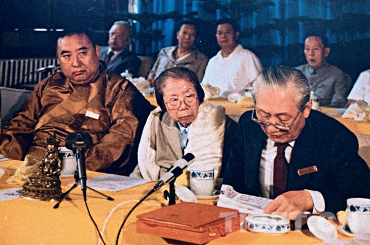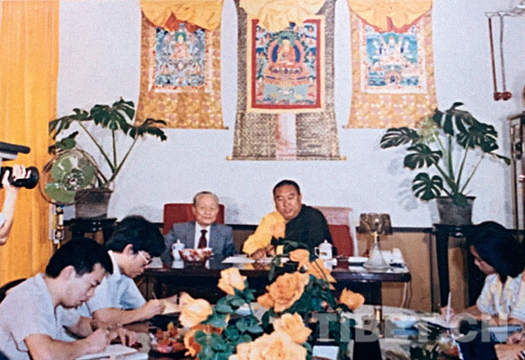 十世班禪和趙樸初顧問在中國藏語系高級佛學院成立儀式新聞發(fā)布會上接受媒體采訪。中國藏語系高級佛學院提供