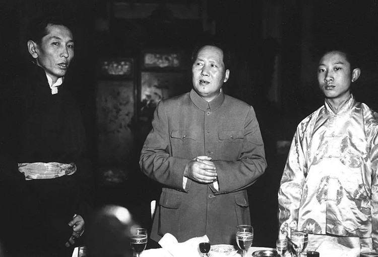 中央人民政府主席毛澤東設(shè)宴祝賀“十七條協(xié)議”的簽訂。毛主席在宴會(huì)上致辭。右為十世班禪,左為西藏地方政府首席全權(quán)談判代表阿沛·阿旺晉美。
